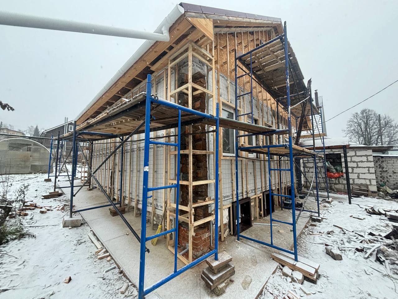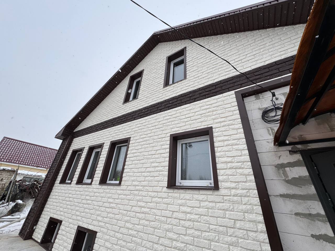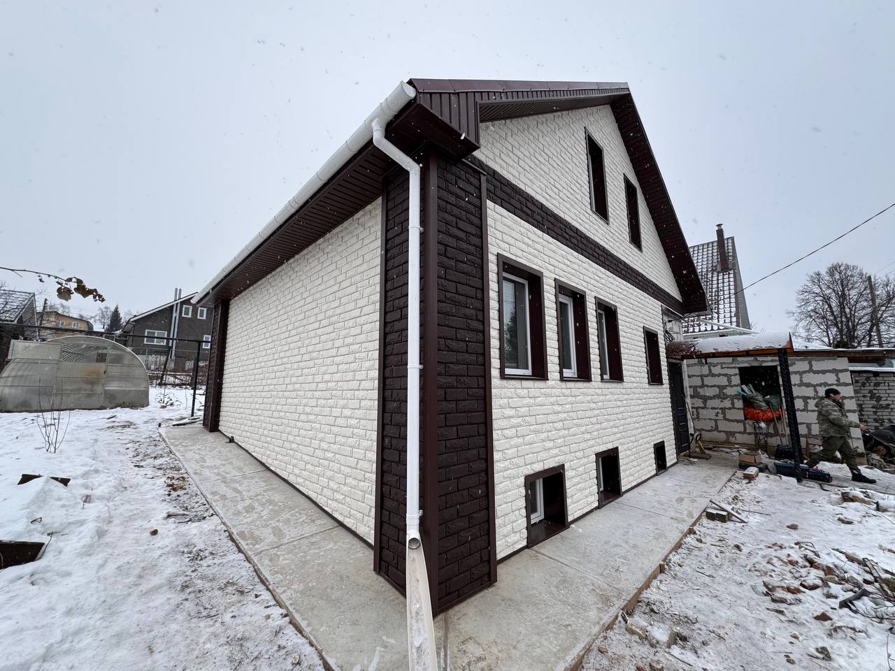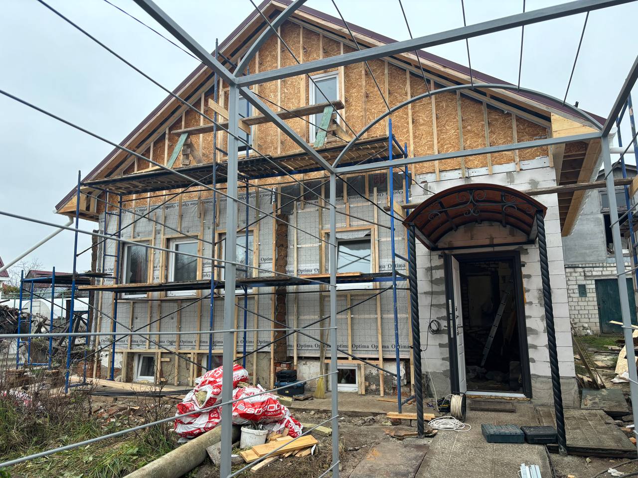 Каркас, утепление, подшив карнизов черновых/чистовых, оконные обрамления, отделка цоколя, доставка, отливы, водостоки демонтаж/монтаж. И т.д.